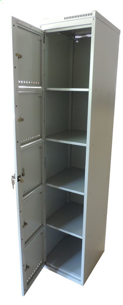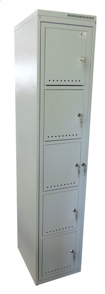 Шкаф имеет одну общую дверь, благодаря чему имеется возможность разложить по ячейкам одежду, а каждый работник имеет доступ только к своей ячейке (одной из пяти). Обычно используется в комплекте со шкафом для сбора одежды ШБ-1.