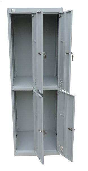 Шкаф изготовлен из высококачественной стали, окрашен порошково-полимерной краской с предварительной обработкой металла (фосфатированием). Оснащение: полка для головного убора, перекладина для плечиков, крючки для вещей и полотенца.